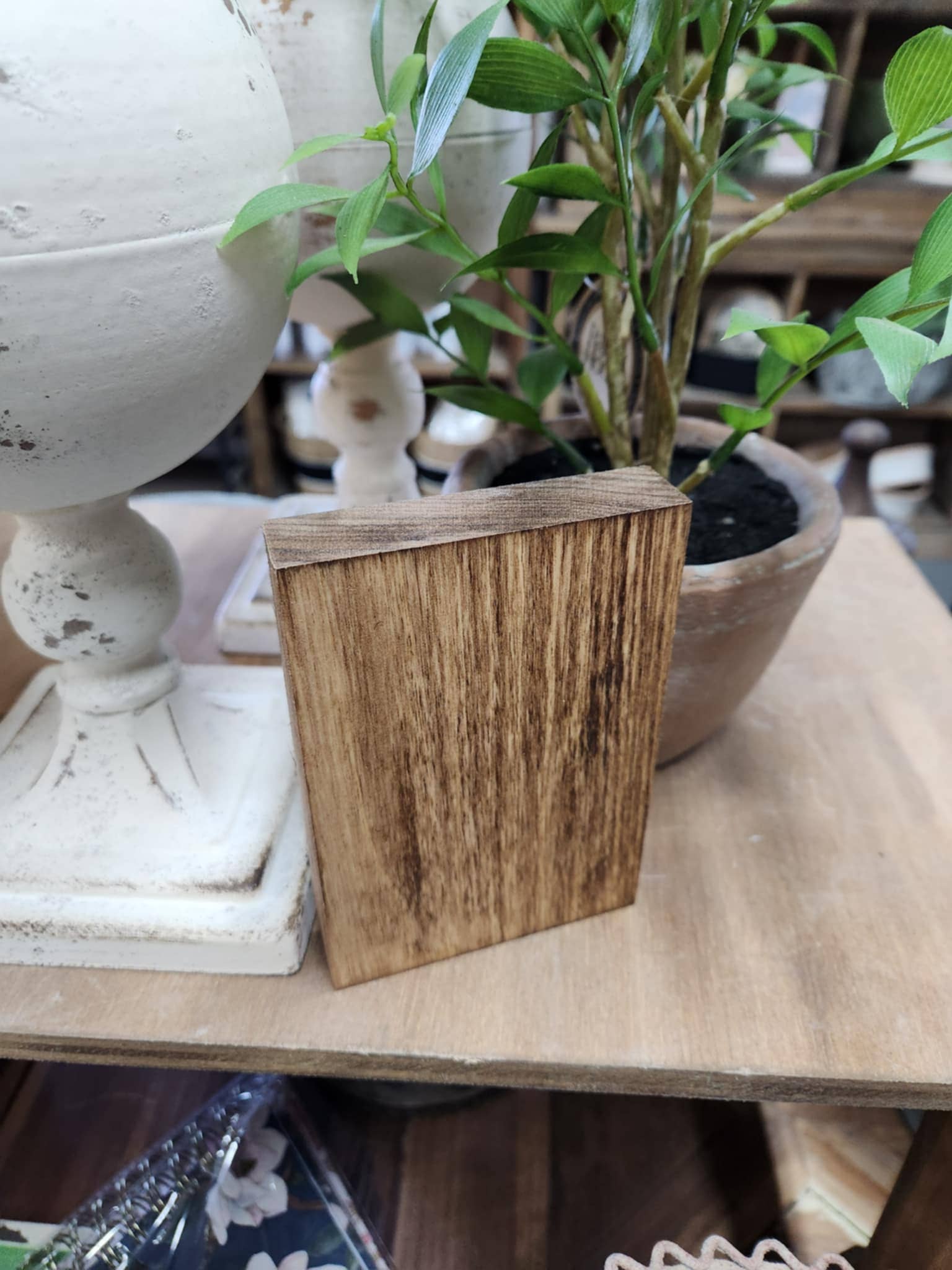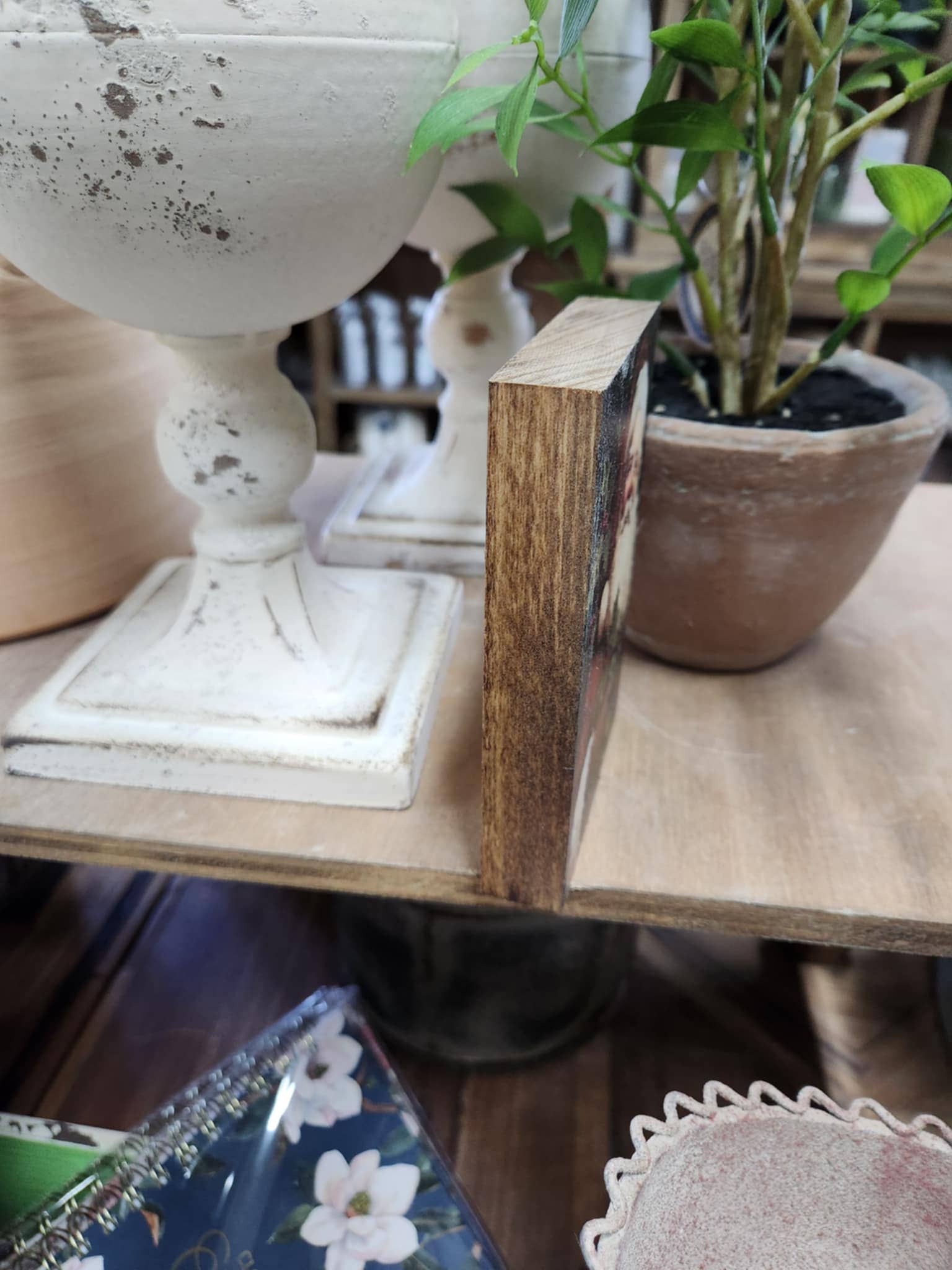 These 3.5x5" blocks are made from solid pine lumber. The artwork is printed on the front using vibrant UV inks. The sides and back of the block are stained in a beautiful Early American tone. These blocks stand on their own and are a perfect decorative addition to tabletops, shelves, mantels, trays, and gift baskets.