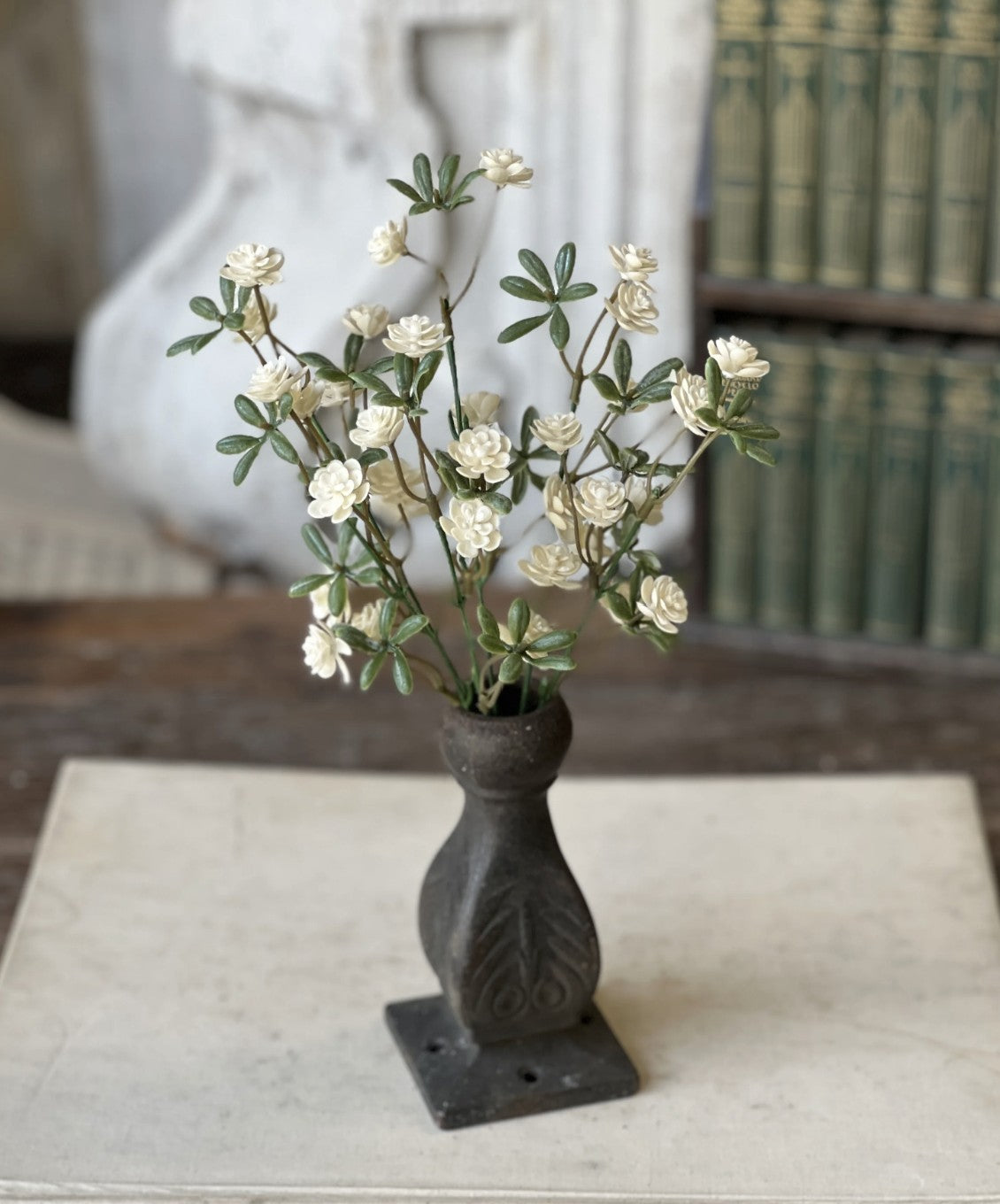 Multi-petaled rosettes dance atop branching stems accented with small bursts of green leaves to create a floral that is small in scale, but delivers a large dose of charm.