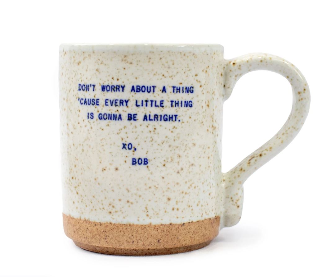 Stoneware mug featuring a quote from Bob Marley. "Don't worry about a thing cause every little thing's gonna be alright."