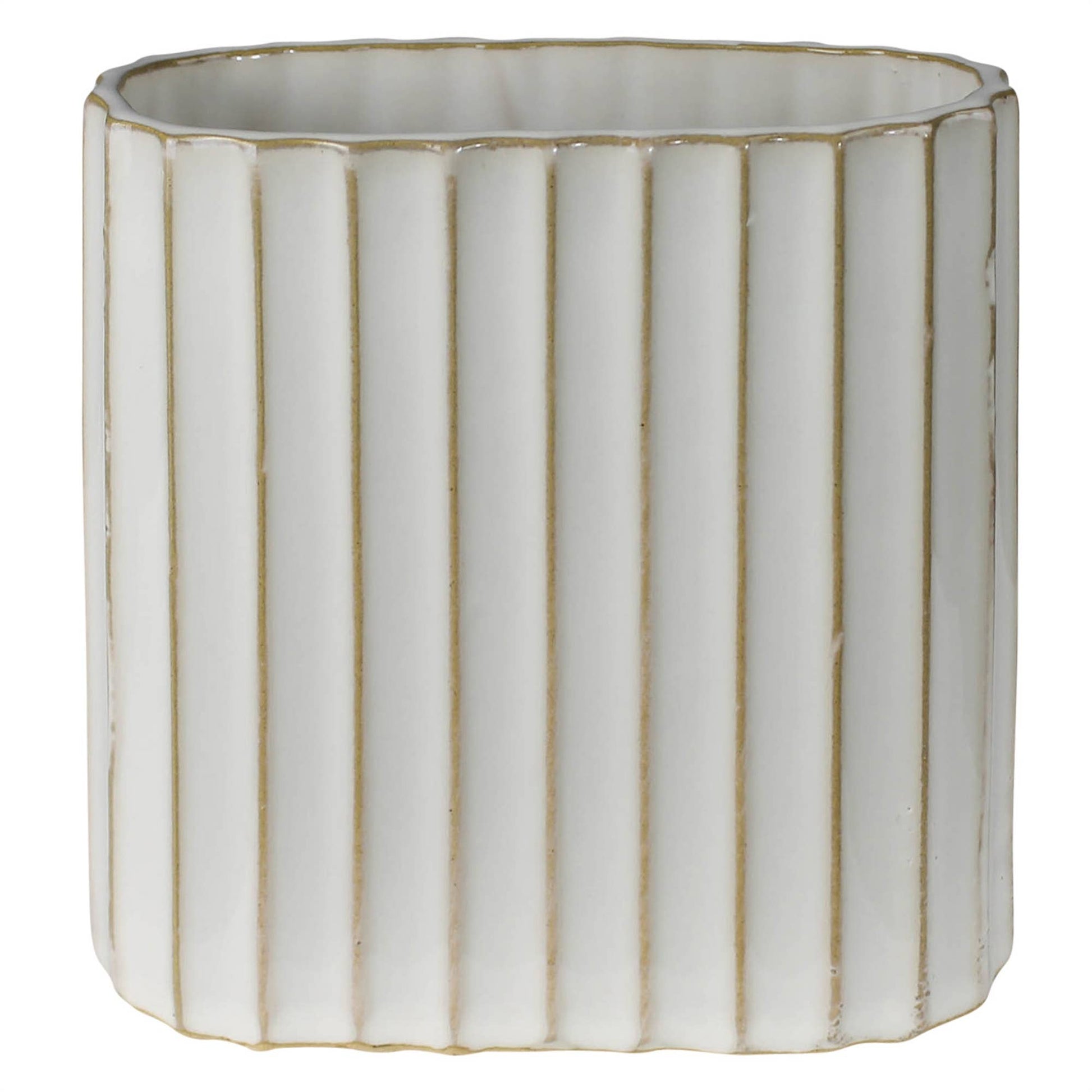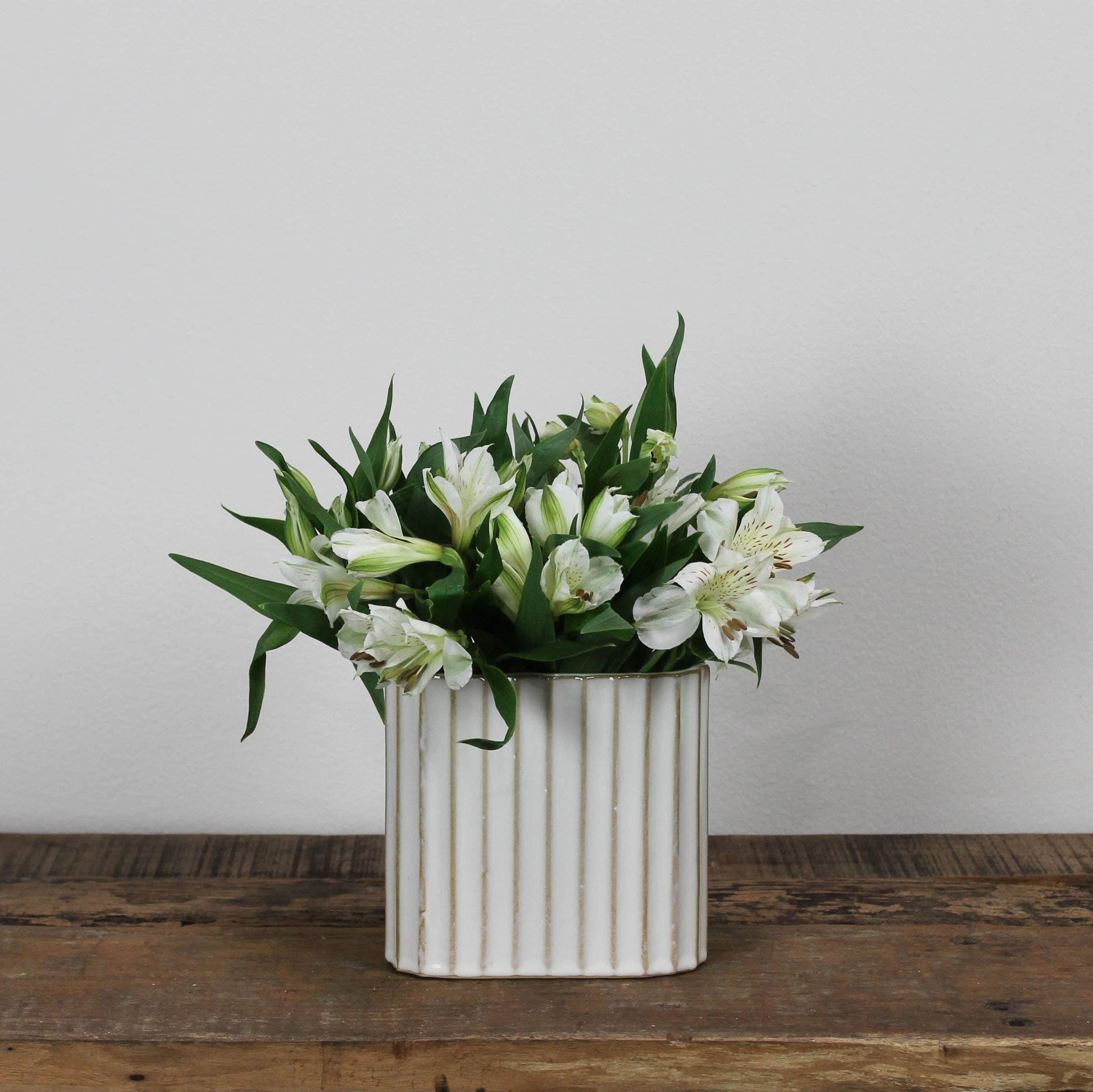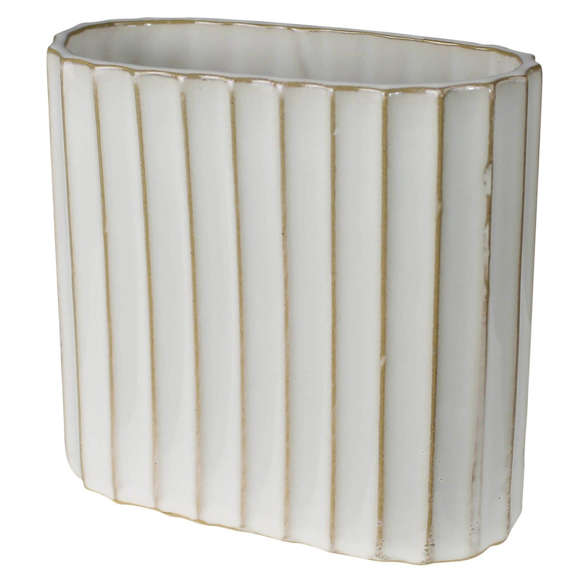 The slender oval proportions of this ribbed ceramic vase creates a perfect vessel for creating dramatic floral arrangements with height and width.
