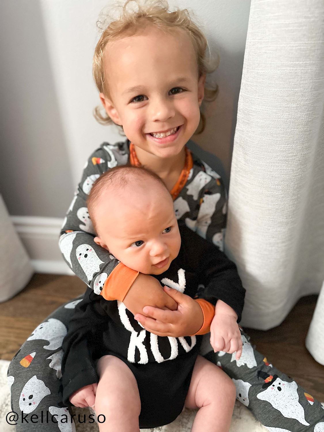 Cotton rib long sleeve crawler with applied boucle sentiment. Inner leg snaps.