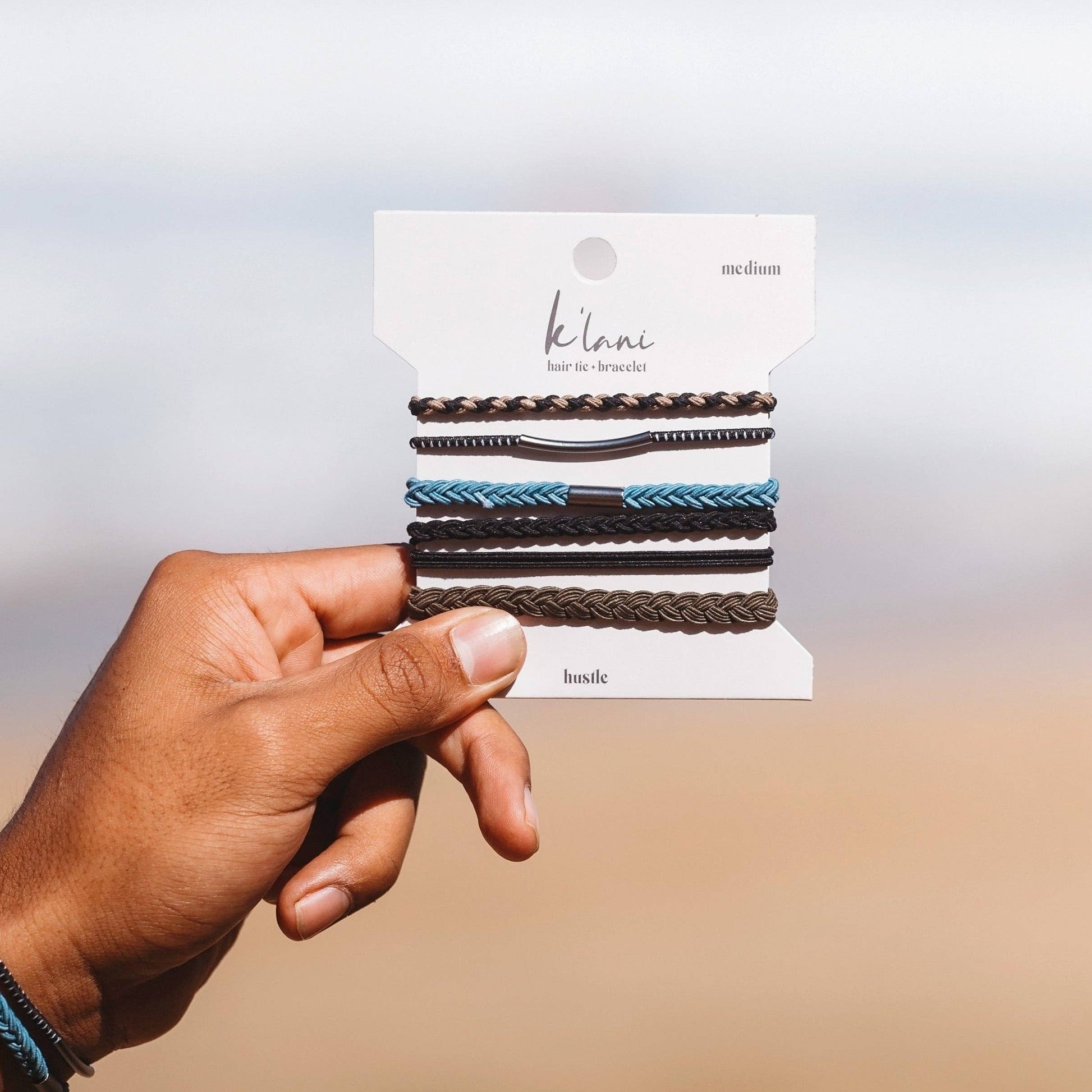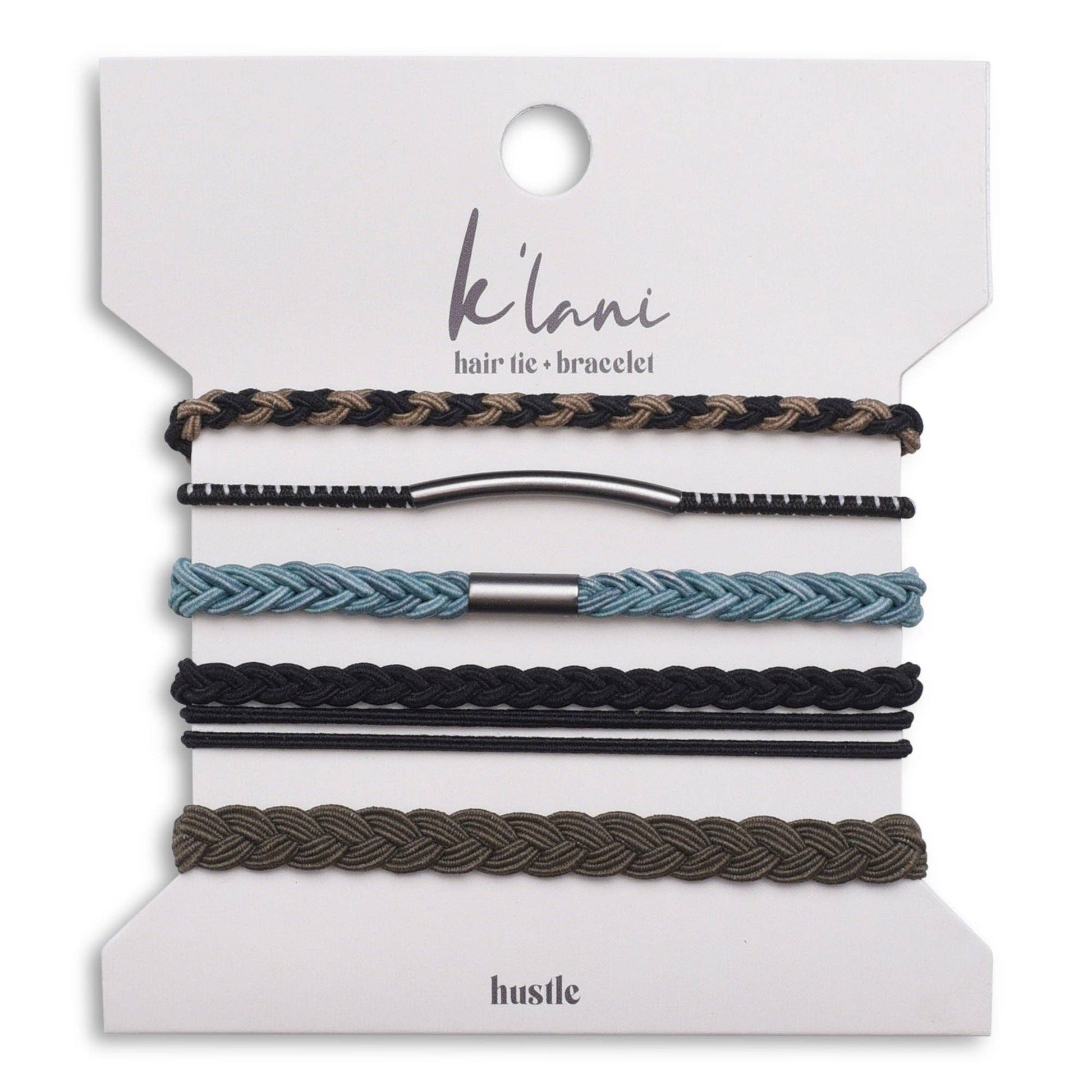 Our HUSTLE set includes five hair tie bracelets in strong colors of black, brown, and blue with matte black details. This set is perfect for guys and girls and will make all who wear it bring a little more hustle to their game. This set is a favorite for guys as well.