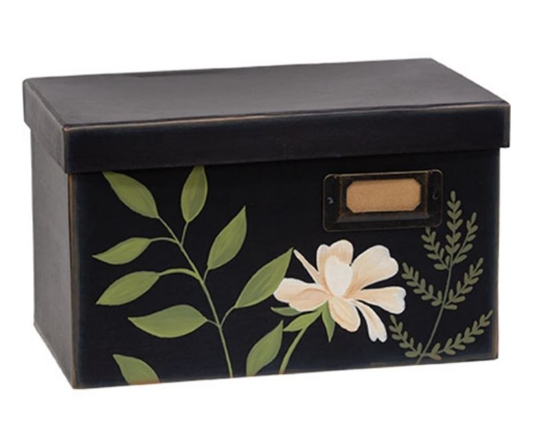 The Leafy Floral File Boxes are three decorative and functional filing containers with a vintage black finish. The boxes feature painted artwork of green leaves and ivory florals, as well as brown paper labels with metal frames. These boxes come in small, medium, and large sizes and work well for storing recipes, paperwork, documents, and other miscellaneous reading and writing materials.